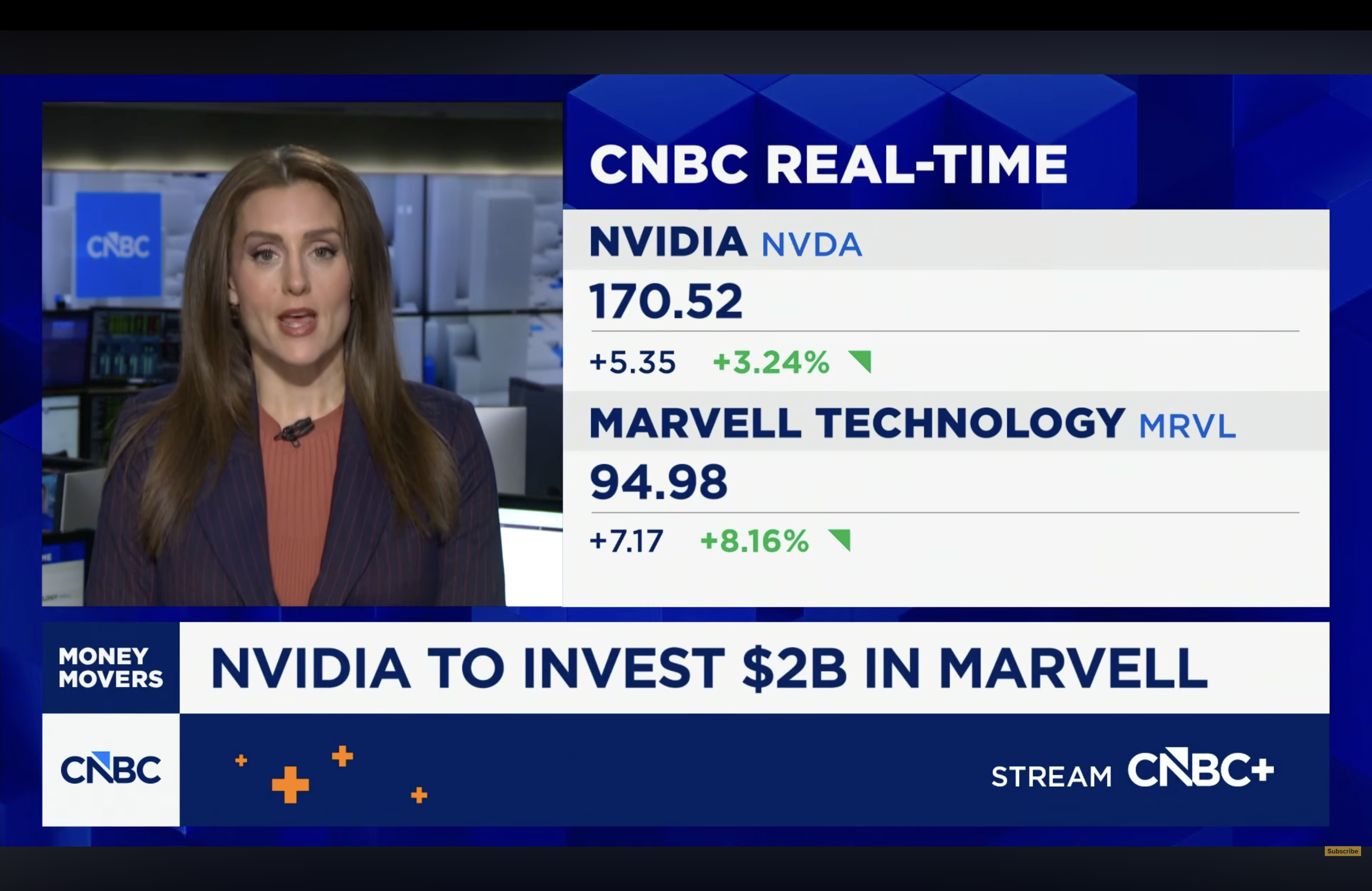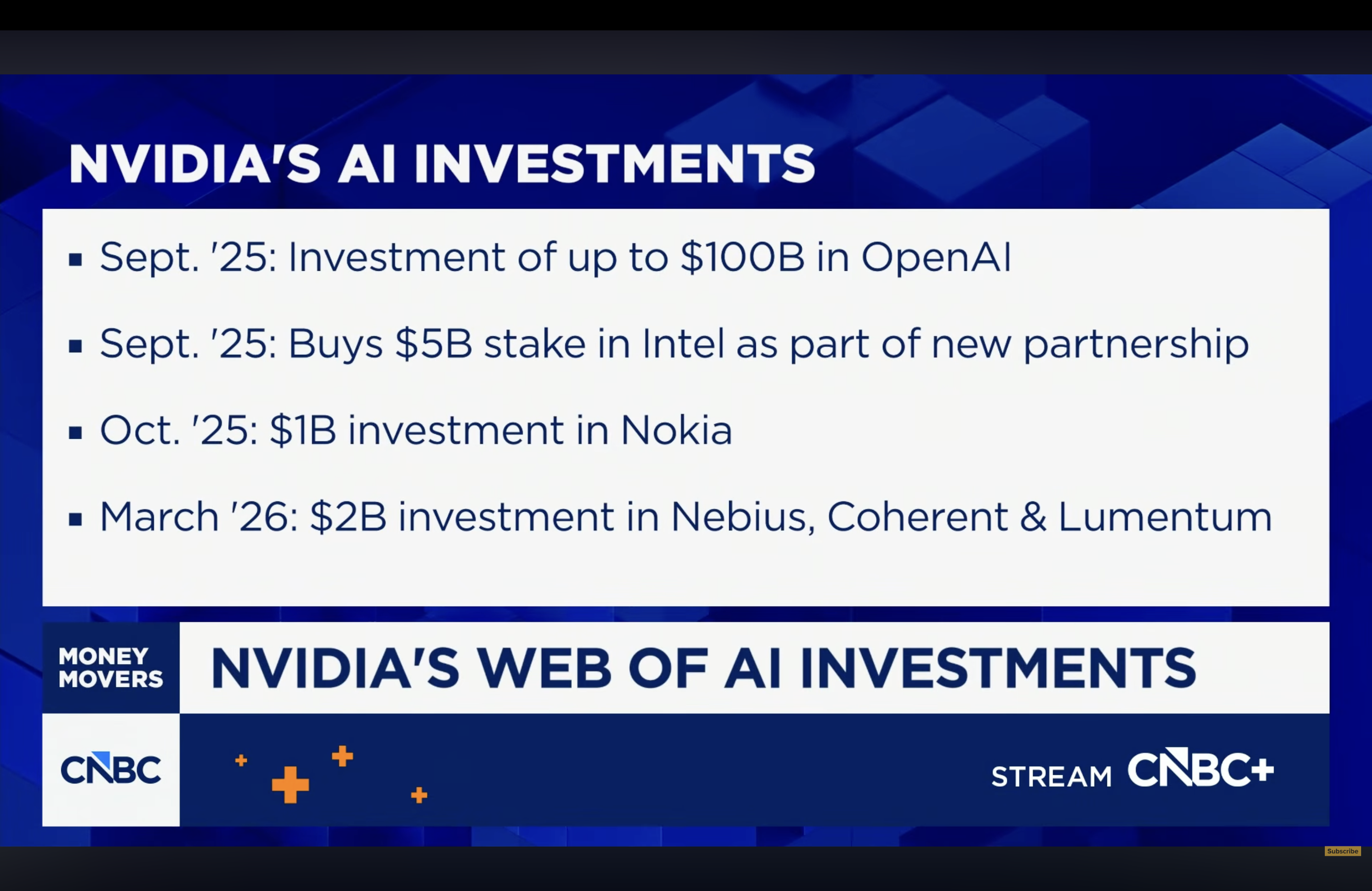 NVIDIA has invested $2 billion in Marvell Technology, a chip company that designs custom AI chips for clients like Amazon. The news sent Marvell's stock up more than 8%. But this is not an isolated deal. It is the latest in a series of billion-dollar investments NVIDIA has made over the past six months, totaling more than $11 billion across optics, cloud, chip design, and telecom. CNBC reporter Kristina Partsinevelos reports that Jensen Huang, CEO of NVIDIA, has been telling investors at every opportunity that NVIDIA is no longer just a chip company. It is an AI infrastructure firm trying to own the entire AI factory, end to end.