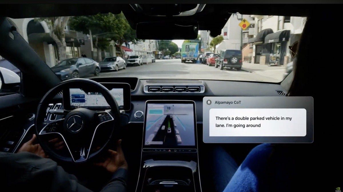 Alpamayo in action: the AI explains its reasoning to the passenger in real time. "There's a double-parked vehicle in my lane. I'm going around." Screenshot from YouTube.